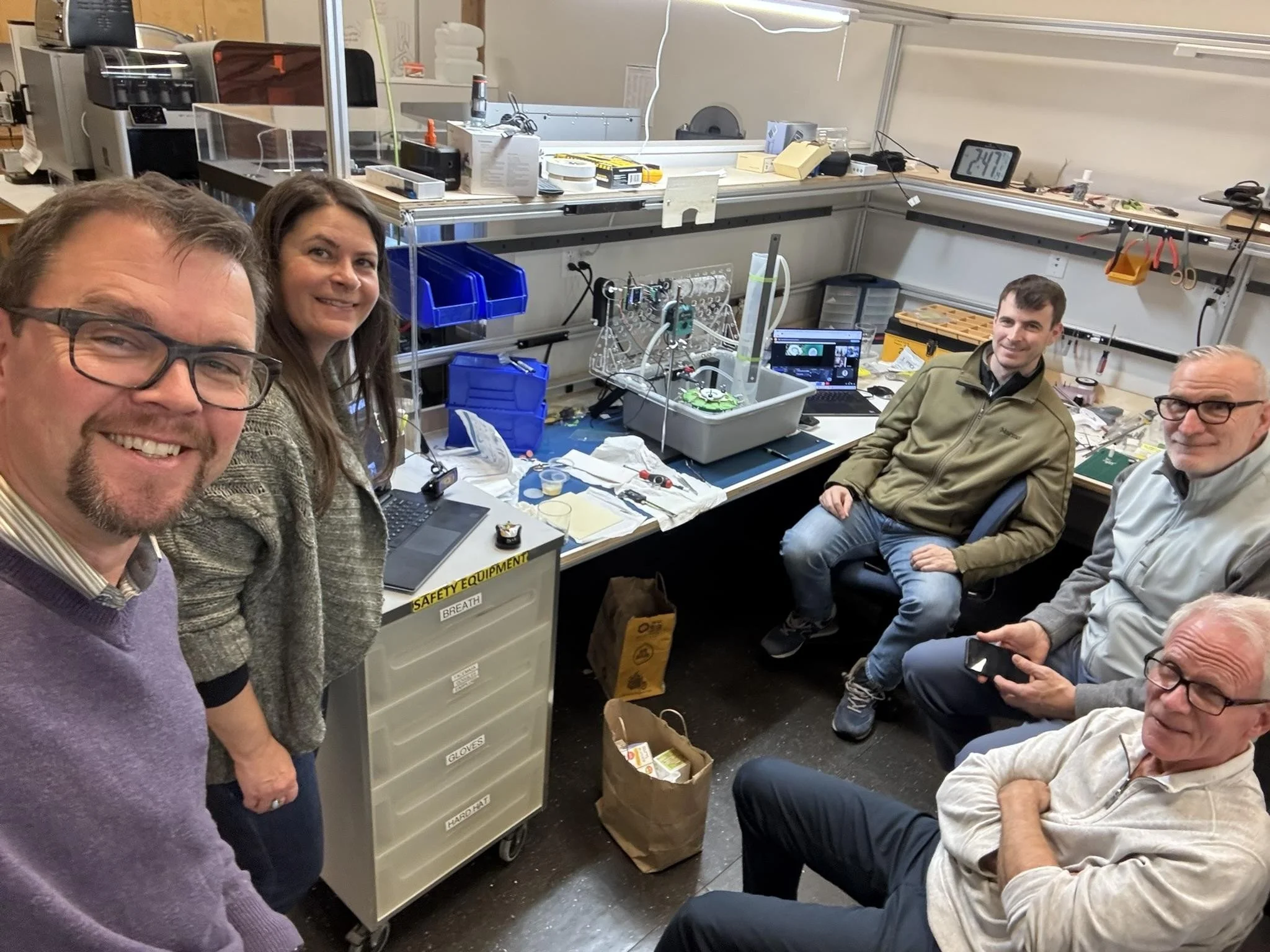 Figure 7 - The PatchClamp experimental lab space at PCS. Shown in image: Scott Thielman, (left) CTO of PCS; Gina Longman, PCS Sr. Project Manager; David Desmarais (next to equipment), PCS Sr. Mechanical Engineer; Joe Piper (seated with smartphone), PatchClamp Board Member; Dr. Marc Mayberg, PatchClamp Founder; not shown: Adam Smith, PCS Sr. Mechanical Engineer, Gary Myles, PatchClamp Counsel; Hans Lundin, PatchClamp Board Member.